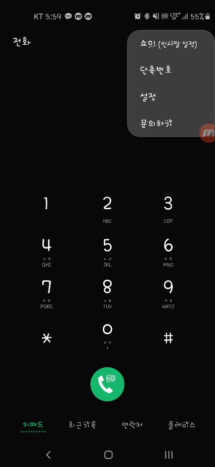 대부분의 갤럭시 스마트폰 통화 화면 UI는 이렇게 구성되어 있습니다. 그리고 모든 화면에는 꼭! 설정 버튼이 있죠! 이 화면에서도 오른쪽 상단에 "설정" 버튼이 있습니다. 이 버튼을 클릭해주세요. 버튼을 클릭하면 기종에 따라서 다르겠지만, 주요 기능등에 대한 기능 버튼들이 존재합니다. 여기서는 "설정" 버튼을 클릭해주세요.