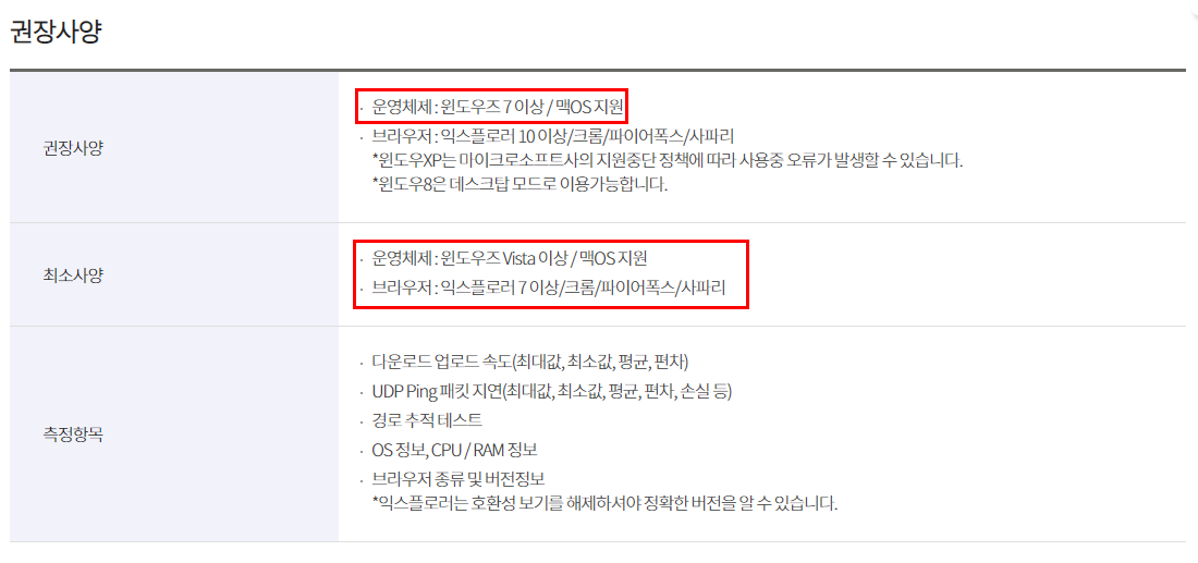 KT 인터넷 속도 측정을 위한 권장 사양입니다. 해당 사양은 권장하는 기본 사양입니다.