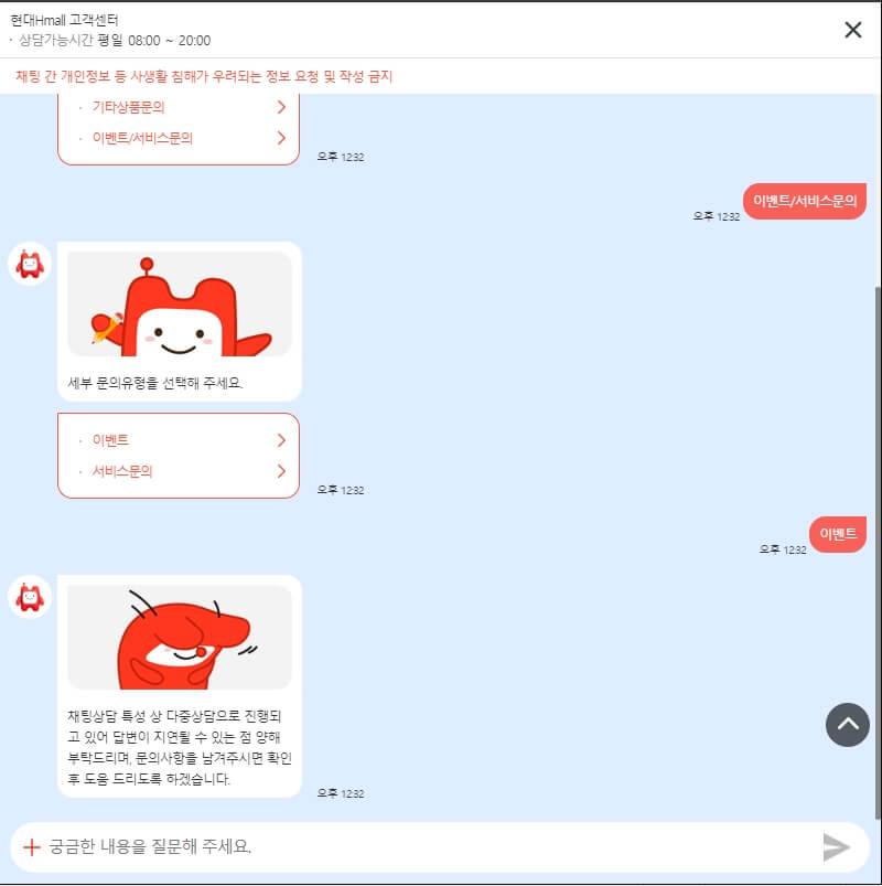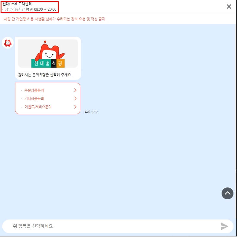 현대몰 고객센터 채솞에 경우는 단순한 FAQ 정도 수준으로 운영되고 있고, 상담원과 연결하는 중간 연결체 역할을 주로 수행하는 것으로 보입니다.