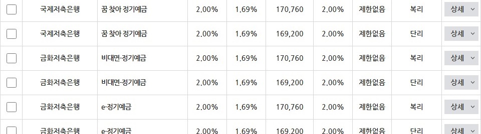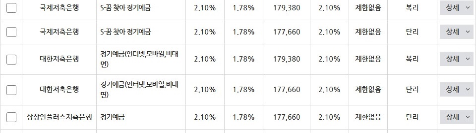| 국제저축은행 | E-꿈 찾아 정기예금 | 2.10% | 1.78% | 177,660 | 2.10% | 제한없음 |
