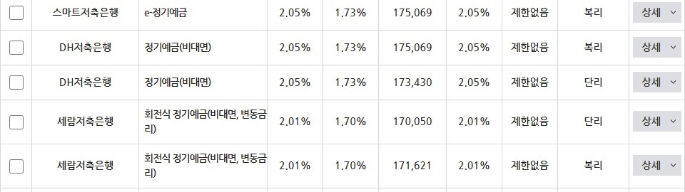 | 상상인플러스저축은행 | 비대면 정기예금 | 2.21% | 1.87% | 186,970 | 2.21% | 제한없음 |