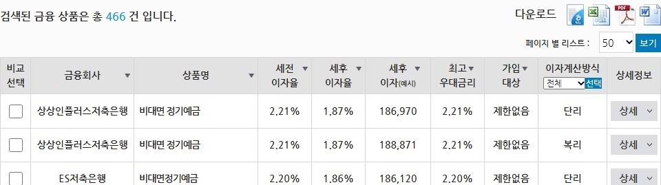 해당 리스트에서 본인이 주로 이용하고 있는 은행에 금리 순위를 확인해보세요. 해당 월 기준으로 검색된 금융 상품은 총 466건입니다.