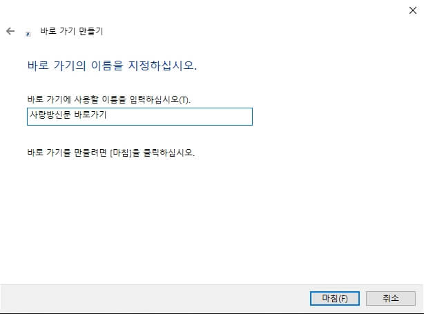 다음 단계에 정보는 특별한 것이 아닙니다. 해당 항목에 이름을 입력하는 단계입니다. 지정하고 싶은 이름을 입력하고, "마침"버튼을 클릭하시면 됩니다. 그럼 간ㄷ나하게 사랑방신문 구인구익 홈페이지로 바로 연결되는 아이콘이 생성됩니다.
