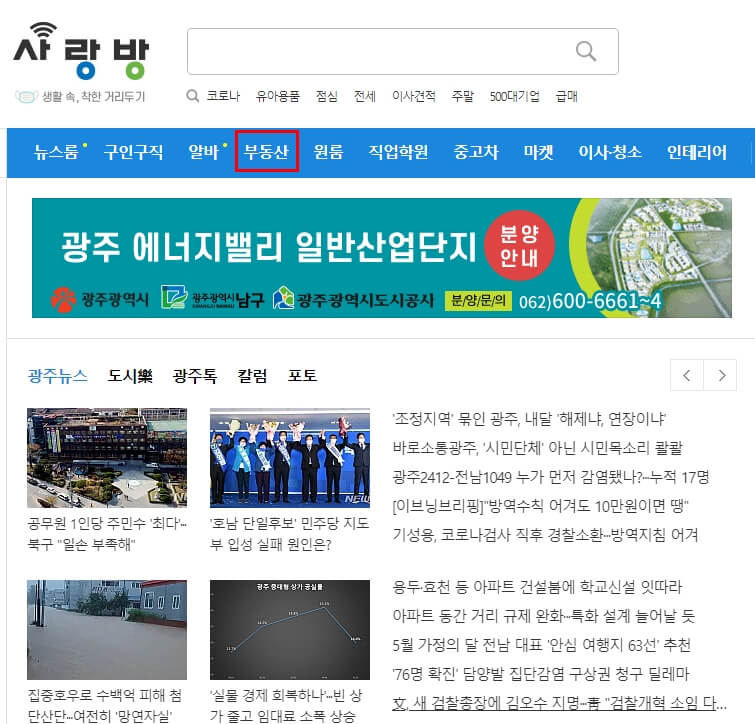 이전 포스팅에서 소개해드렸던, 사랑방 신문사는 광주 지역에 특화 되어 있는 미디어 플랫폼입니다. 해당 홈페이지에서 다양한 서비스가 있습니다. 이 중에서 구인구직도 인기가 많이 있겠지만, 부동산 메뉴 또한 상당히 인기가 많은것으로 인지됩니다.