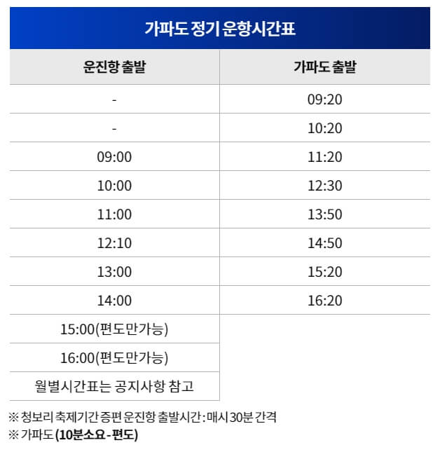 가장 중요한 정보는 가파도 정기 운항시간표를 통해서 예약 가능 식나을 확인해야합니다. 아마 운행하는 계절에 따라서 운항 시간표가 변동이 발생할 수 있기 때문에 주기적으로 확인하세요.