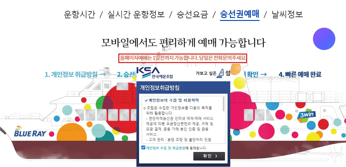 이런 주요 정보까지 다 확인했다면 내가 실제로 승선권을 구매할 수 있는 메뉴를 통해서 가파도로 가는 승선권을 예매해보세요. 예매를 진행하기 위해서는 주요 공지를 확인해야합니다. 중앙에 빨간색으로 표기 되어 있는 "홈페이지예매는 1일전까지 가능합니다. 당일은 전화문의주세요." 라고 공지되어 있습니다.