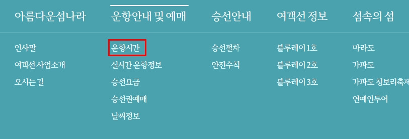 본격적으로 해당 공식 홈페이지에서 운항시간 부터 확인하여 현재 날짜에 운행 예약이 가능한지 확인해야합니다. 해당 정보를 확인 할 수 있는 메뉴가 바로 "운항시간"이라는 메뉴입니다. 해당 메뉴를 클릭하여 세부적인 정보를 확인 할 수 있는 페이지로 이동해보세요.