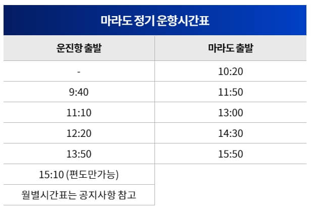 해당 페이지로 이동하면 마라도 정기 운항 시간표도 함게 확인 할 수 있습니다. 운진항 출발하는 첫 시간 오전 9시 40분부터 시작하게 됩니다. 그리고 마지막 운진항 출발 시간은 15시10분 입니다. 운행 시간에 따라서 다시 나올수 없을수도 있기 때문에 꼭 확인해야합니다.