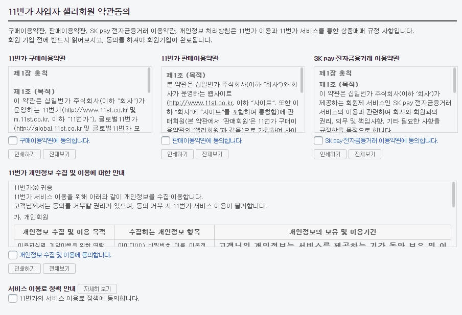 회원가입하기 위한 다양한 이용약관들입니다. 11번가 판매자센터에 경우는 전자 상거래, 전자 금융거래 관련하여 다양한 약관이 있기 때문에 다른 일반 사이트에 비해서 약관이 많이 존재합니다.