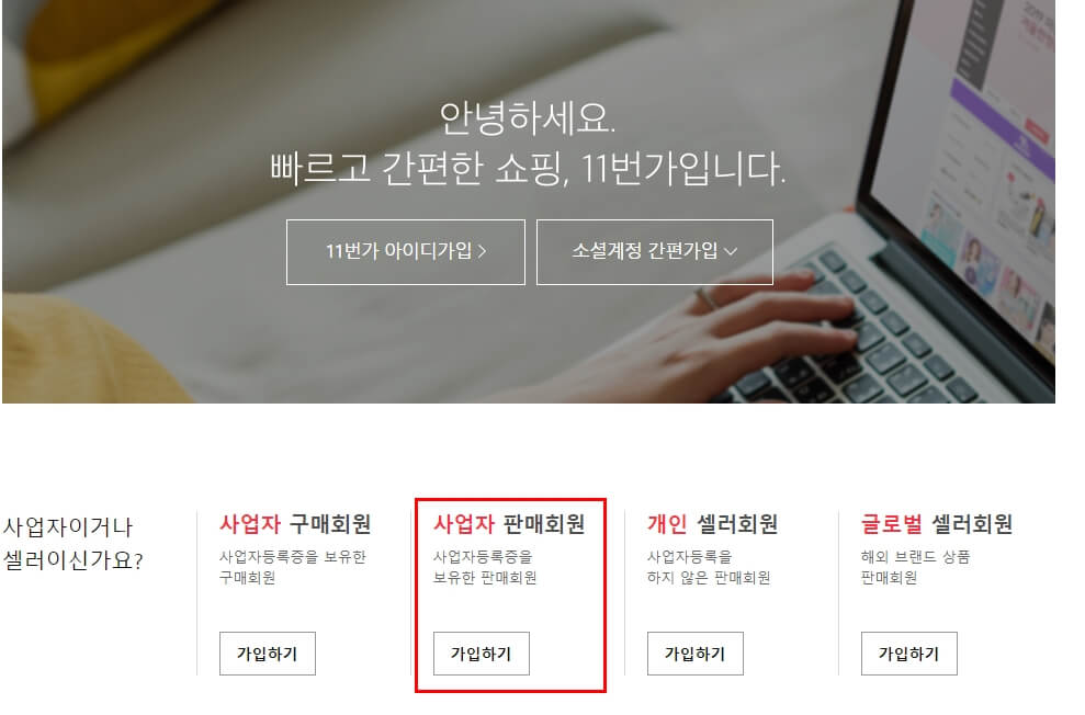 이런 약관에 동의하는 사용자가 정식 사업자를 부여 받은지 여부를 확인하는 단계도 함께 존재합니다. 만약 사업자 유형으로 가입을 희망하다면, 11번가 판매자 센터 회원가입 시 사업자 등록증을 준비해주세요.