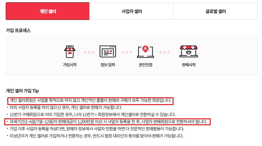 회원 유형은 크게 개인 셀러, 사업자 셀러, 글로벌 셀러로 구분됩니다. 가장 먼저 확인 하려는 개인 셀러에 경우는 사업 목적으로 하지 않고 개인적인 물품을 판매하는 사용자 유형을 의미합니다. 부업을 하거나 소량으로 물품을 판매하는 유형이 해당 조건에 부합하지 않을까 싶습니다.
