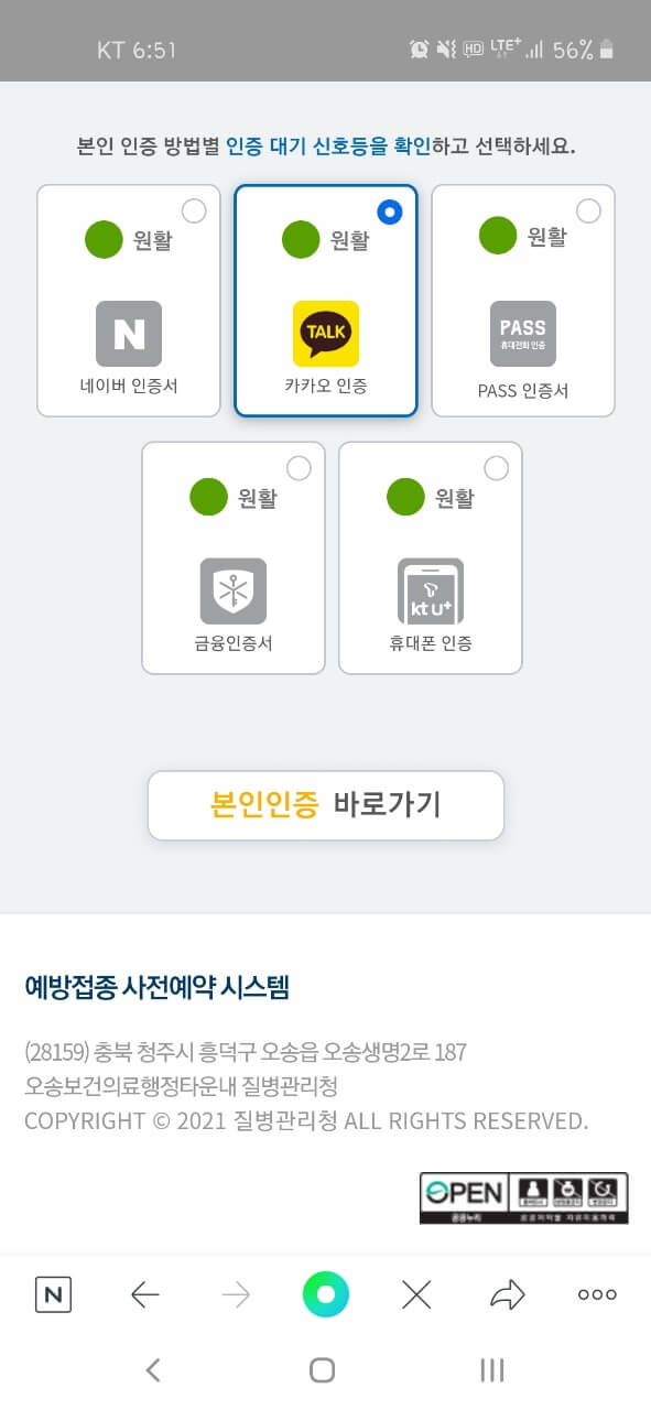 단순히 문자인증 뿐만아니라, 상당히 다양한 본인 인증 방법을 제공하고 있습니다. 총 5가지 방법(네이버인증서, 카카오인증, PASS 인증, 금융인증서, 휴대폰 인증) 중에서 본인이 편한 방법을 선택해주세요. 개인적으로 별도에 준비물이 필요 없는 카카오 인증을 통해서 본인 인증을 수행하도록 하겠습니다.